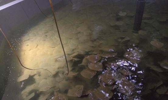 2014年6月-2015年5月,項目組與山東東方海洋科技股份有限公司萊州分公司合作,開展了以大菱鲆為代表的規(guī)模化循環(huán)水高端養(yǎng)殖模式技術(shù)研究。項目組在改進原有循環(huán)水工程系統(tǒng)、優(yōu)化養(yǎng)殖技術(shù)的基礎(chǔ)上,開展了高、中、低三種密度的養(yǎng)殖對比實驗,獲得了大菱鲆在規(guī)?;a(chǎn)條件下的生長率、成活率、餌料系數(shù)、經(jīng)濟效益以及水質(zhì)調(diào)控能力等多項技術(shù)參數(shù),并與原生產(chǎn)車間的養(yǎng)殖進行了實時對比,取得了大菱鲆工廠化循環(huán)水三個不同養(yǎng)殖階段的實際生產(chǎn)數(shù)據(jù),獲得了三個生產(chǎn)階段的適宜放養(yǎng)規(guī)格、養(yǎng)殖密度、養(yǎng)殖周期、分級策略以及循環(huán)系統(tǒng)的實時調(diào)整方案,初步建立起工廠化循環(huán)水高效養(yǎng)殖管理技術(shù)和規(guī)范化的運行模式。