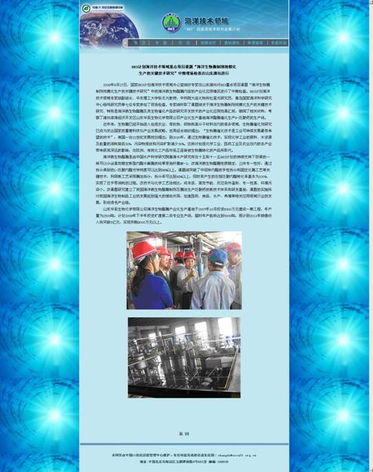 黃海所承擔(dān)的國(guó)家“十一五”863計(jì)劃海洋技術(shù)領(lǐng)域“新型海洋生物制品研究開(kāi)發(fā)”重點(diǎn)項(xiàng)目課題之一“海洋生物酶制劑規(guī)模化生產(chǎn)的關(guān)鍵技術(shù)研究”自2009年9月27日立項(xiàng)以來(lái),已取得多項(xiàng)階段性成果,其中:“海洋微生物酯酶及其生物催化產(chǎn)品研究開(kāi)發(fā)技術(shù)的產(chǎn)業(yè)化應(yīng)用”得到了專家組的充分肯定,科技部國(guó)家863海洋技術(shù)領(lǐng)域?qū)υ撗芯砍晒M(jìn)行了宣傳。(詳見(jiàn)http://www.863.org.cn/)