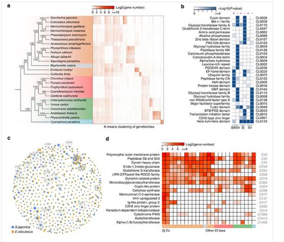 研究團隊獲得了海帶主要栽培品系的高質(zhì)量基因組組裝結(jié)果,組裝大小為537 Mb,覆蓋了全基因組序列的98.5%,共有18,733個蛋白編碼基因。比較基因組學(xué)分析發(fā)現(xiàn)海帶基因組擴增主要源于基因家族的擴增,海帶與絲狀褐藻水云的祖先獲得1,240個基因家族,其中與細胞壁合成、鹵素代謝、發(fā)育與防御有關(guān)的基因家族出現(xiàn)明顯擴增。進一步的功能分析發(fā)現(xiàn),褐藻膠合成關(guān)鍵酶甘露糖醛酸C-5差向異構(gòu)酶及鹵素代謝關(guān)鍵酶鹵素過氧化物酶通過基因大量復(fù)制實現(xiàn)其功能分化。