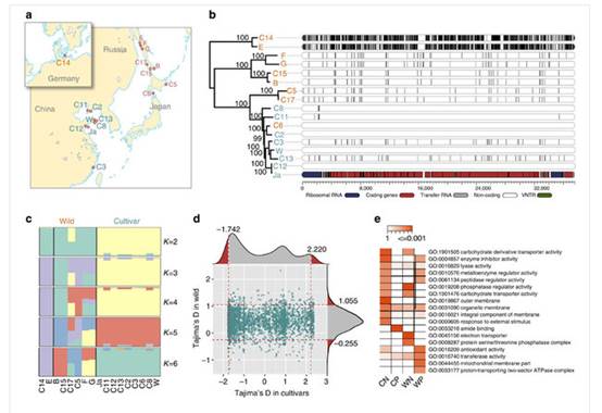 中國的海帶栽培面積和產(chǎn)量占世界總量的90%以上,直接和間接產(chǎn)值超過百億元。然而,近年來我國乃至世界海帶育種難以取得突破性的進展、單產(chǎn)很難大幅提升,主要原因是目前海帶品種的生物多樣性水平低,遺傳基礎(chǔ)狹窄,匱乏的種質(zhì)和基因資源成為制約海帶育種研究的關(guān)鍵。研究人員獲得了有代表性的7份養(yǎng)殖海帶和9份野生海帶的高覆蓋度基因組草圖,通過比較分析,在全基因組水平上全面解析了栽培和野生海帶種間遺傳變異,從養(yǎng)殖群體中平均識別了約0.94M SNVs和96K的小INDELs,從野生群體中平均識別了約2.27M SNVs和274K的小INDELs。這些遺傳變異位點為后續(xù)的馴化基因選擇及優(yōu)質(zhì)品種選育提供了重要的數(shù)據(jù)基礎(chǔ)。盡管養(yǎng)殖海帶和野生海帶存在不同程度的基因交流,但中國養(yǎng)殖海帶主要來源于日本的同一個地理群體,養(yǎng)殖品系由于頻繁自交已經(jīng)呈現(xiàn)明顯的退化狀態(tài)。