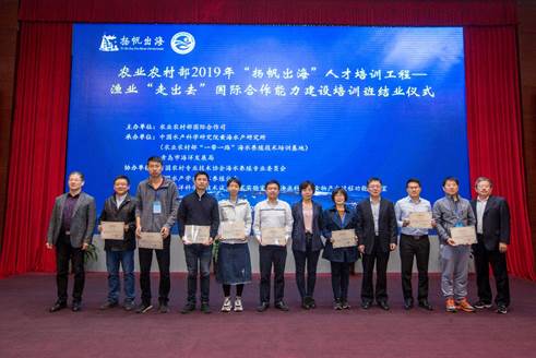 結(jié)業(yè)儀式上,與會領(lǐng)導(dǎo)對學(xué)員們順利完成培訓(xùn)表示祝賀,希望學(xué)員們能夠繼續(xù)務(wù)實推動漁業(yè)國際合作,與世界各國,尤其是“一帶一路”國家深化漁業(yè)科技和產(chǎn)業(yè)合作,推進漁業(yè)科技國際合作協(xié)同創(chuàng)新。農(nóng)業(yè)對外合作部際聯(lián)席會議辦公室楊光副處長,中國水產(chǎn)科學(xué)研究院劉英杰副院長,中國水產(chǎn)科學(xué)研究院黃海水產(chǎn)研究所金顯仕所長、李健副所長向?qū)W員頒發(fā)了證書。