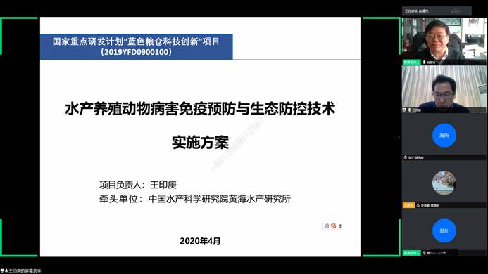 4月24日,由中國水產(chǎn)科學(xué)研究院黃海水產(chǎn)研究所牽頭承擔(dān)的國家重點(diǎn)研發(fā)計(jì)劃“藍(lán)色糧倉科技創(chuàng)新”重點(diǎn)專項(xiàng)—“水產(chǎn)養(yǎng)殖動物病害免疫預(yù)防與生態(tài)防控技術(shù)”項(xiàng)目啟動會以視頻會議的形式召開。啟動會由黃海水產(chǎn)研究所所長金顯仕主持,科學(xué)技術(shù)部中國農(nóng)村技術(shù)開發(fā)中心“藍(lán)色糧倉科技創(chuàng)新”項(xiàng)目專員魯淼、農(nóng)業(yè)農(nóng)村部漁業(yè)漁政管理局漁情監(jiān)測與市場加工處處長徐樂俊,山東省黃河三角洲農(nóng)業(yè)高新技術(shù)產(chǎn)業(yè)示范區(qū)管委會副主任王守寶,項(xiàng)目咨詢專家組桂建芳院士、包振民院士、宋林生教授、王春琳教授、楊紅生研究員、劉英杰研究員、徐皓研究員、郝智慧教授、王雷研究員、汪開毓教授、艾桃山研究員、李色東教授級高工和辛乃宏教授級高工等應(yīng)邀出席會議。項(xiàng)目首席、課題負(fù)責(zé)人及項(xiàng)目骨干等100余人參加了本次視頻會議。