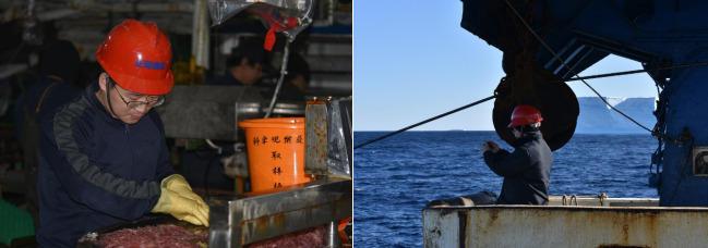 圖2.樊鋼洲(左:兼捕魚類取樣;右:海鳥與哺乳動(dòng)物觀測(cè))