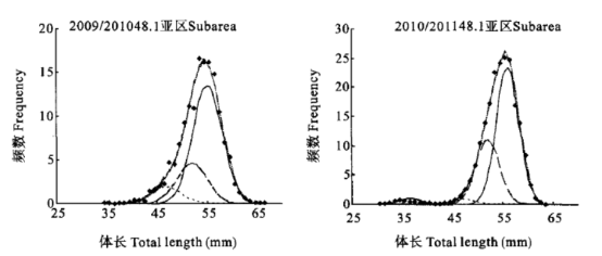 圖6. 混合分布分析南極大磷蝦捕撈群體的L/F分布及年齡組成