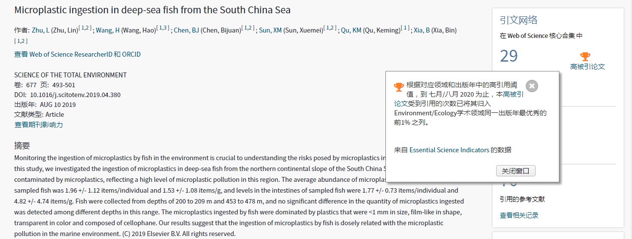 根據(jù)11月24日基本科學指標數(shù)據(jù)庫(Essential Science Indicators, ESI)分析數(shù)據(jù)顯示,中國水產(chǎn)科學研究院黃海水產(chǎn)研究所陳碧鵑研究員領(lǐng)銜的漁業(yè)環(huán)境污染生態(tài)學團隊發(fā)表的海洋微塑料污染特征研究論文《Microplastic pollution in North Yellow Sea, China: Observations on occurrence, distribution and identification》(Zhuet al., 2018, Science of the Total Environment)《Microplastic ingestion in deep-sea fish from the South China Sea》(Zhuet al., 2019, Science of the Total Environment)入選ESI高被引論文(ESI-Highly Cited Papers)。本次ESI數(shù)據(jù)統(tǒng)計區(qū)間覆蓋了從2010年至2020年8月期間發(fā)表的論文。