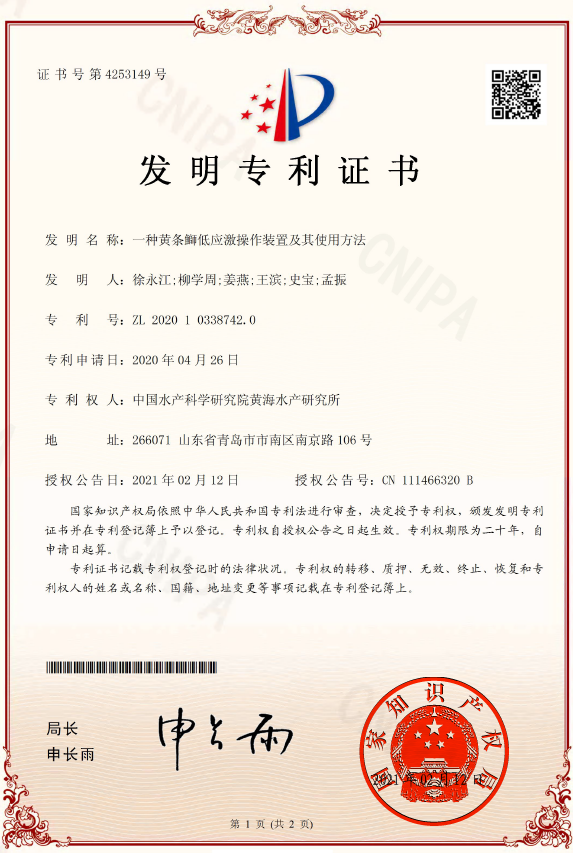 近日,由中國(guó)水產(chǎn)科學(xué)研究院黃海水產(chǎn)研究所徐永江等發(fā)明的“一種黃條鰤低應(yīng)激操作裝置及其使用方法”獲國(guó)家發(fā)明專(zhuān)利授權(quán),專(zhuān)利號(hào):ZL202010338742.0。
