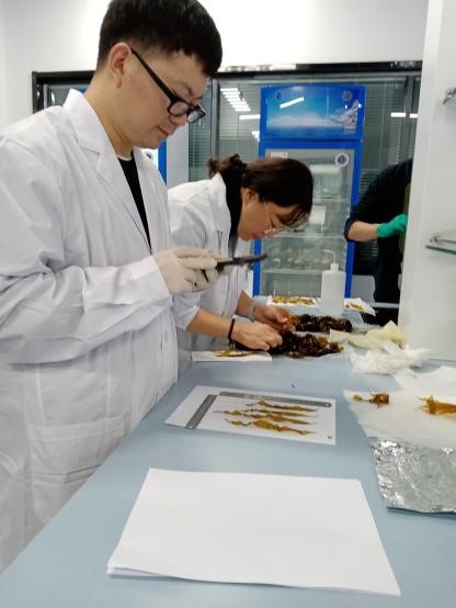 11月3日起,調(diào)查小組在小組負(fù)責(zé)人張曉雯研究員帶領(lǐng)下先后對山東、遼寧、福建三省啟動調(diào)查工作。為保證獲得的數(shù)據(jù)全面、真實(shí)、可靠,調(diào)查組成員嚴(yán)格按照《大型藻類樣品采集技術(shù)規(guī)范》對海帶和裙帶菜個體進(jìn)行了生物學(xué)特性測量,完成種質(zhì)資源特征特性測定和遺傳多樣性評價樣本收集;按照《大型藻類種質(zhì)資源遺傳材料制作規(guī)范》完成了活體、標(biāo)本、基因、細(xì)胞等種質(zhì)資源的采集和制作。各項工作的展開均做好完備的現(xiàn)場調(diào)查記錄并保留圖文檔案。