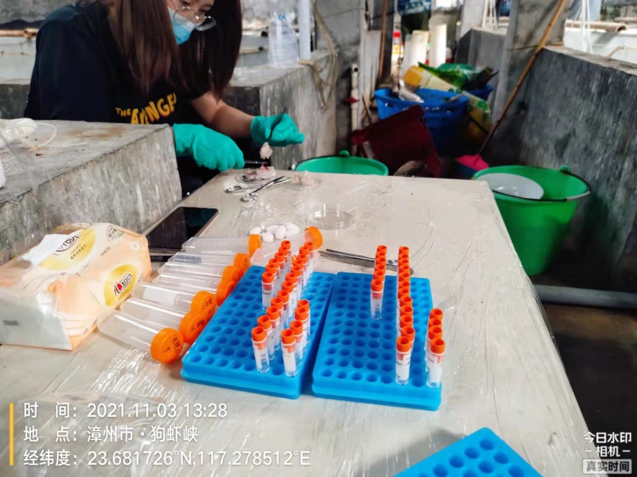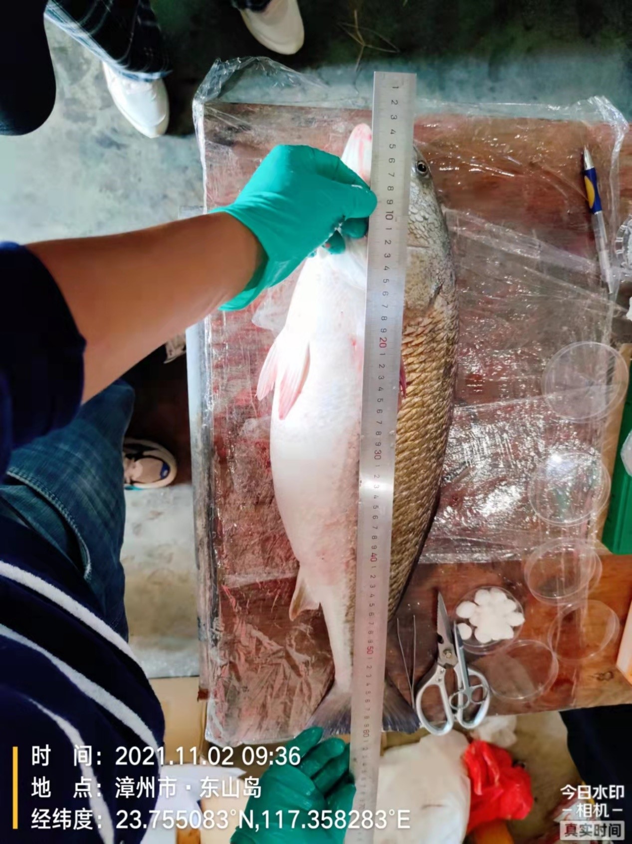 9月初,調(diào)查小組先后奔赴青島西海岸新區(qū)、日照、福建等地,按計劃開展資源調(diào)查工作。團隊成員嚴格遵循《魚類樣品采集技術(shù)規(guī)范》要求,詳實記錄每個調(diào)查場所的水質(zhì)參數(shù)、個體數(shù)量性狀、組織、圖像等數(shù)據(jù)及樣品的收集工作。根據(jù)《魚類種質(zhì)資源遺傳材料制作規(guī)范》要求,開展了各個調(diào)查點基因、細胞等種質(zhì)資源及標本的采集和制作,填寫完成《水產(chǎn)養(yǎng)殖種質(zhì)資源基礎(chǔ)信息表》,保證了收集數(shù)據(jù)的詳實可靠。根據(jù)各個調(diào)查點的實際養(yǎng)殖情況,經(jīng)過協(xié)商,選擇性開展了美國紅魚種質(zhì)的活體保存工作,其中福建逸有水產(chǎn)科技有限公司、福建高成水產(chǎn)養(yǎng)殖場及青島清峰漁業(yè)有限公司保存5-6齡親魚共1000尾,后備親魚(4齡)2500尾,其余四家調(diào)研點各保存后備親魚300尾,并作了詳細登記、存檔。