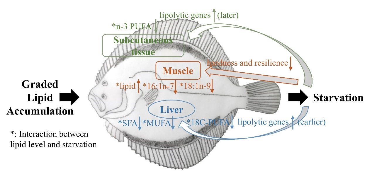 水產(chǎn)養(yǎng)殖的發(fā)展正由“規(guī)模導(dǎo)向”向“質(zhì)量導(dǎo)向”轉(zhuǎn)變,而脂肪酸營養(yǎng)品質(zhì)是養(yǎng)殖魚類肉質(zhì)品質(zhì)的重要組成部分。研究團(tuán)隊(duì)以大菱鲆為研究對象,通過投喂不同脂質(zhì)水平的飼料構(gòu)建了不同脂肪蓄積水平的大菱鲆幼魚,然后在不同饑餓時間點(diǎn)采樣檢測脂肪酸動態(tài)變化情況和脂代謝基因表達(dá)情況,以分析“脂肪蓄積×饑餓時間”對脂肪酸豐度變化及脂代謝狀態(tài)的交互影響。結(jié)果發(fā)現(xiàn),饑餓過程優(yōu)先消耗了肝臟和鰭條附近皮下脂肪組織中的脂肪,而飼料脂肪水平和饑餓對大菱鲆肌肉脂肪含量具有協(xié)同升高作用。脂肪酸的供能動員順序及脂解相關(guān)基因表達(dá)時序在大菱鲆不同組織中顯著不同,且“脂肪蓄積×饑餓時間”對脂肪酸組成具有一系列交互影響(圖1)。與該研究同一系列的其他研究工作近期獲2項(xiàng)國家發(fā)明專利授權(quán),開拓了養(yǎng)殖魚類脂肪酸營養(yǎng)品質(zhì)調(diào)控新方法。