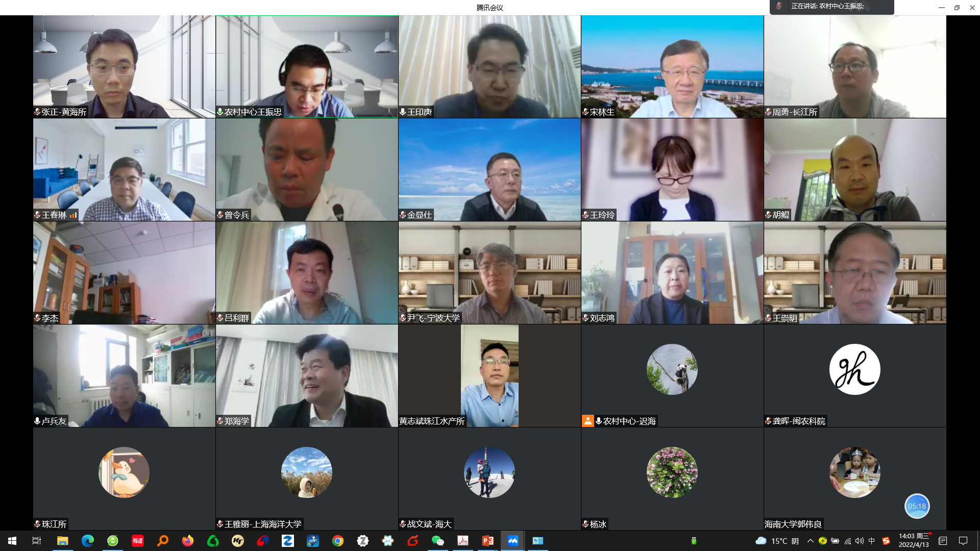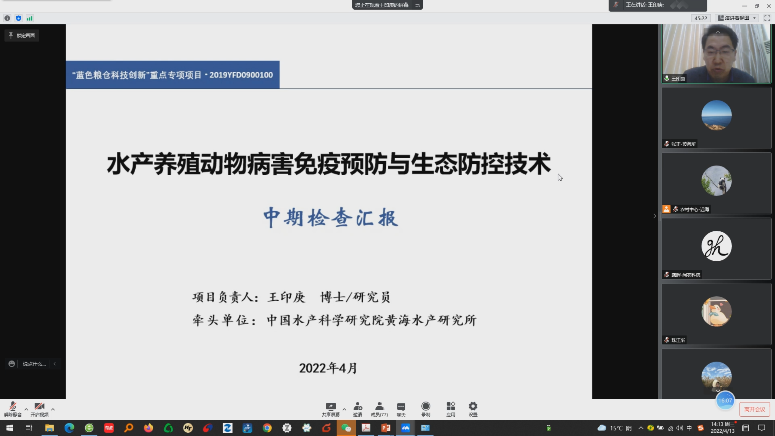 4月13日,由中國水產(chǎn)科學(xué)研究院黃海水產(chǎn)研究所牽頭承擔(dān)的國家重點(diǎn)研發(fā)計劃“藍(lán)色糧倉科技創(chuàng)新”重點(diǎn)專項“水產(chǎn)養(yǎng)殖動物病害免疫預(yù)防與生態(tài)防控技術(shù)”項目中期檢查會以視頻會議形式召開。會議由科學(xué)技術(shù)部中國農(nóng)村技術(shù)開發(fā)中心主辦。中心科技攻關(guān)處處長盧兵友,“藍(lán)色糧倉科技創(chuàng)新”專項專員王振忠,項目中期檢查專家組專家宋林生教授、王春琳教授、何建國教授、鄭海學(xué)研究員、王玲玲教授,黃海水產(chǎn)研究所所長金顯仕、科研處處長劉志鴻,以及項目負(fù)責(zé)人、課題負(fù)責(zé)人、項目成員等100余人參加了本次會議。