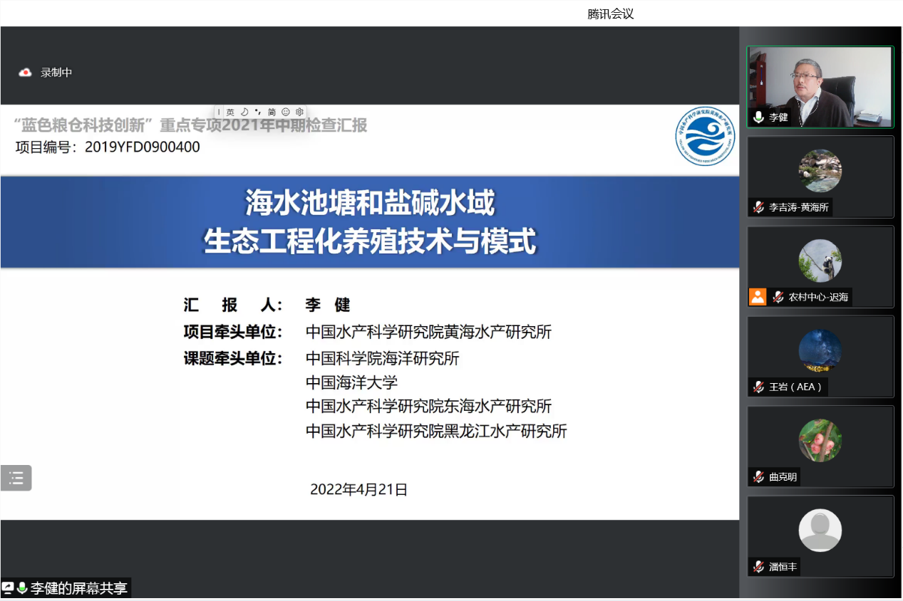4月21日,中國(guó)水產(chǎn)科學(xué)研究院黃海水產(chǎn)研究所牽頭承擔(dān)的國(guó)家重點(diǎn)研發(fā)計(jì)劃“藍(lán)色糧倉(cāng)科技創(chuàng)新”重點(diǎn)專(zhuān)項(xiàng)“海水池塘和鹽堿水域生態(tài)工程化養(yǎng)殖技術(shù)與模式”項(xiàng)目中期檢查會(huì)以視頻會(huì)議形式召開(kāi)。會(huì)議由科學(xué)技術(shù)部中國(guó)農(nóng)村技術(shù)開(kāi)發(fā)中心主辦,“藍(lán)色糧倉(cāng)科技創(chuàng)新”專(zhuān)項(xiàng)項(xiàng)目專(zhuān)員王振忠主持。農(nóng)村中心科技攻關(guān)處處長(zhǎng)盧兵友,項(xiàng)目中期檢查專(zhuān)家組專(zhuān)家桂建芳院士、楊紅生研究員、方輝研究員、陳煥根研究員、呂劍研究員,黃海水產(chǎn)研究所所長(zhǎng)金顯仕、科研處處長(zhǎng)劉志鴻,以及項(xiàng)目負(fù)責(zé)人、課題負(fù)責(zé)人、項(xiàng)目成員等參加了本次會(huì)議。