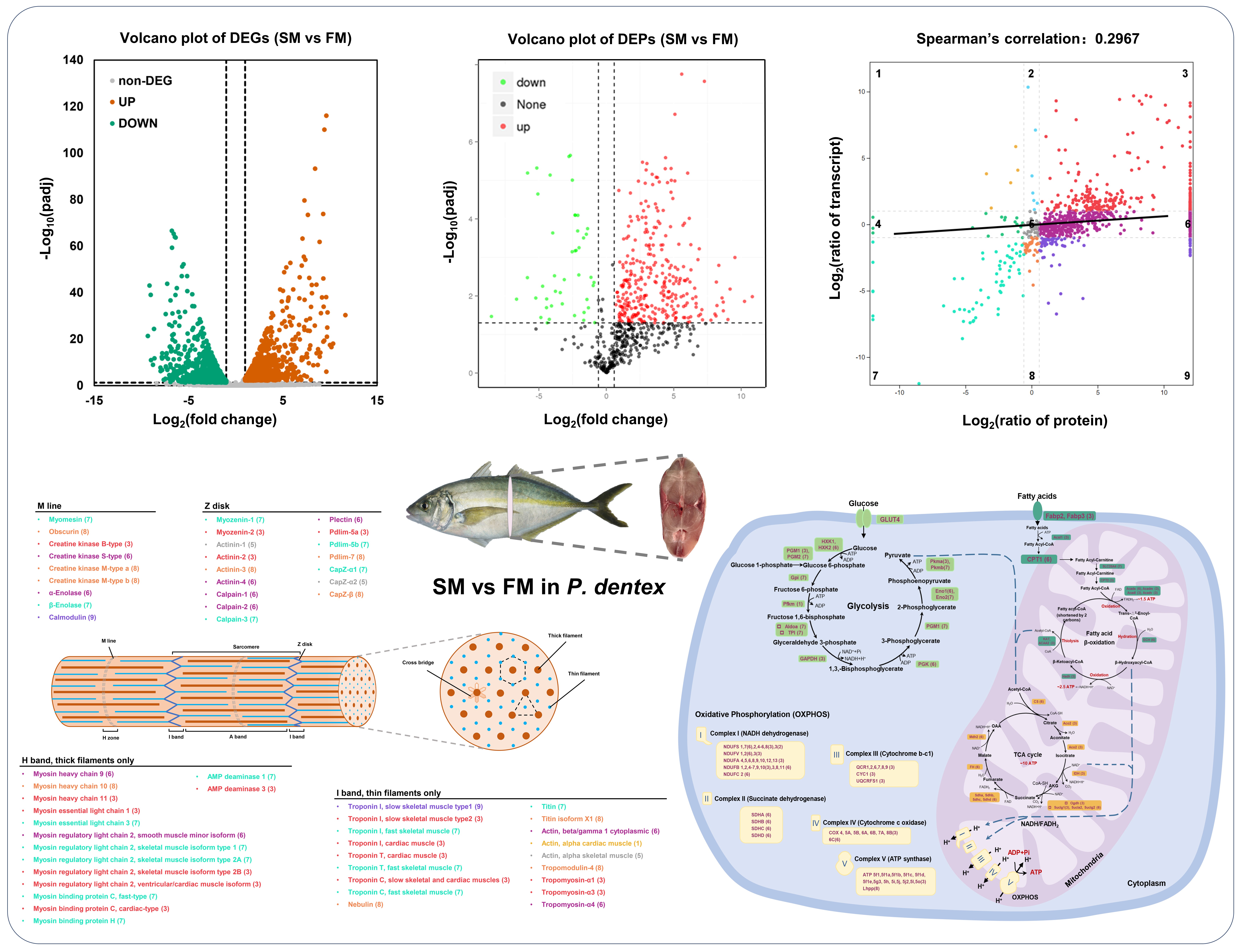 通過(guò)比較分析快慢肌轉(zhuǎn)錄組和蛋白組兩個(gè)水平的分子特征及其差異,發(fā)現(xiàn):(1)兩種肌肉類(lèi)型間存在2862個(gè)差異表達(dá)基因(1419個(gè)基因在慢肌中高表達(dá),1443個(gè)基因在快肌中高表達(dá)),主要富集在肌肉收縮、氧化磷酸化、脂肪酸代謝和糖酵解等相關(guān)通路;(2)兩種肌肉類(lèi)型間存在471個(gè)差異表達(dá)蛋白(422個(gè)在慢肌中高表達(dá),49個(gè)在快肌中高表達(dá)),主要差異蛋白為肌纖維結(jié)構(gòu)和能量代謝相關(guān)蛋白;(3)轉(zhuǎn)錄組-蛋白質(zhì)組聯(lián)合分析顯示,mRNA與蛋白質(zhì)的倍數(shù)變化之間的線性關(guān)系較弱,提示轉(zhuǎn)錄后調(diào)控在黃帶擬鲹骨骼肌蛋白質(zhì)的表達(dá)中廣泛存在;(4)對(duì)肌纖維結(jié)構(gòu)蛋白分析發(fā)現(xiàn),慢肌和快肌纖維的主要結(jié)構(gòu)蛋白組成相似,但是存在肌纖維特異的蛋白亞型,其特異性表達(dá)可能是導(dǎo)致快慢肌纖維結(jié)構(gòu)差異的關(guān)鍵;(5)對(duì)參與脂肪酸代謝、糖酵解、TCA循環(huán)和氧化磷酸化等能量代謝途徑的關(guān)鍵因子進(jìn)一步分析發(fā)現(xiàn),多種關(guān)鍵酶在兩種肌肉類(lèi)型間存在mRNA和蛋白水平的共同表達(dá)差異,這可能是導(dǎo)致快慢肌能量代謝差異的關(guān)鍵。這些發(fā)現(xiàn)豐富和加深了對(duì)硬骨魚(yú)類(lèi)快慢肌在肌纖維結(jié)構(gòu)和能量代謝差異方面的分子調(diào)控機(jī)制的認(rèn)識(shí)。