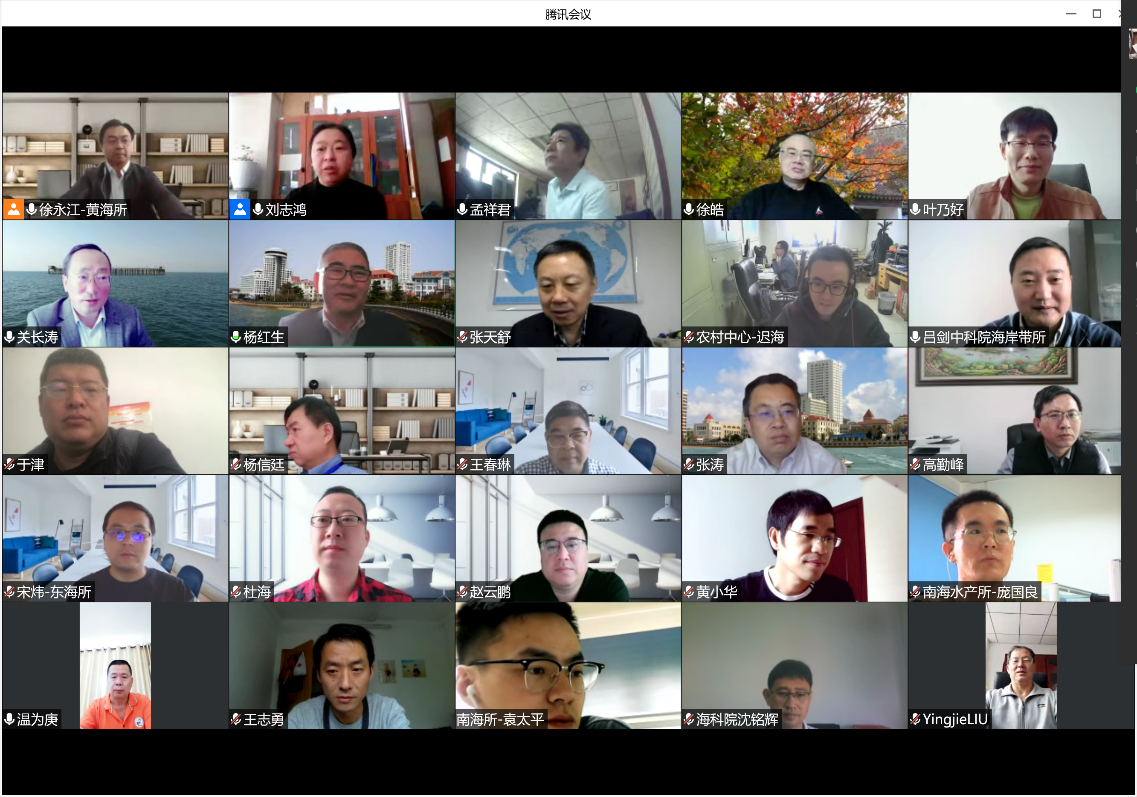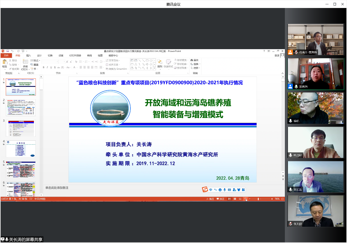 4月28日,由中國水產(chǎn)科學(xué)研究院黃海水產(chǎn)研究所牽頭承擔(dān)的國家重點(diǎn)研發(fā)計(jì)劃“藍(lán)色糧倉科技創(chuàng)新”重點(diǎn)專項(xiàng)“開放海域和遠(yuǎn)海島礁養(yǎng)殖智能裝備與增殖模式(2019YFD0900900)”項(xiàng)目年度總結(jié)暨工作推進(jìn)會(huì)以視頻會(huì)議形式召開。項(xiàng)目咨詢專家組由國家農(nóng)業(yè)信息化工程技術(shù)研究中心楊信廷研究員、中國水產(chǎn)有限公司張?zhí)焓娓呒?jí)工程師、中國科學(xué)院海洋研究所楊紅生研究員、中國水產(chǎn)科學(xué)研究院劉英杰研究員、漁業(yè)機(jī)械儀器研究所徐皓研究員、寧波大學(xué)王春琳教授、中國科學(xué)院煙臺(tái)海岸帶研究所呂劍研究員組成。科技部中國農(nóng)村技術(shù)開發(fā)中心專項(xiàng)管理團(tuán)隊(duì)遲海項(xiàng)目專員與會(huì)指導(dǎo)。來自黃海水產(chǎn)研究所、大連理工大學(xué)、南海水產(chǎn)研究所、東海水產(chǎn)研究所、海南省海洋與漁業(yè)科學(xué)院、浙江海洋大學(xué)、漁業(yè)機(jī)械儀器研究所、萊州明波水產(chǎn)有限公司、煙臺(tái)中集藍(lán)海洋科技有限公司、三沙美濟(jì)漁業(yè)發(fā)展有限公司等10家項(xiàng)目參與單位共50余人參加了本次會(huì)議。
