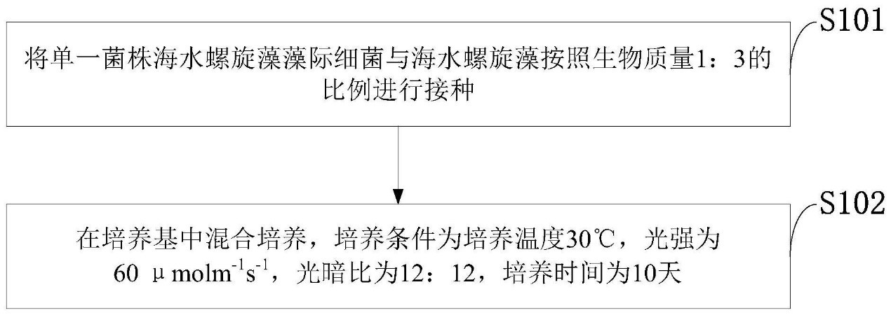 本發(fā)明屬于海水養(yǎng)殖尾水處理技術(shù)領(lǐng)域,公開了一種海水螺旋藻?藻際細(xì)菌共生體系、構(gòu)建方法及應(yīng)用,共生體系為單一菌株海水螺旋藻藻際細(xì)菌和海水螺旋藻共培養(yǎng),菌種由海水螺旋藻培養(yǎng)液中自行分離;接種時海水螺旋藻藻際細(xì)菌與海水螺旋藻生物質(zhì)量比為1:3。將單一菌株海水螺旋藻藻際細(xì)菌與海水螺旋藻按照生物質(zhì)量1:3的比例進(jìn)行接種;在培養(yǎng)基中混合培養(yǎng);培養(yǎng)條件為培養(yǎng)溫度30℃,光強為60μmol·m?1·s?1,光暗比為12:12,培養(yǎng)時間為10天。