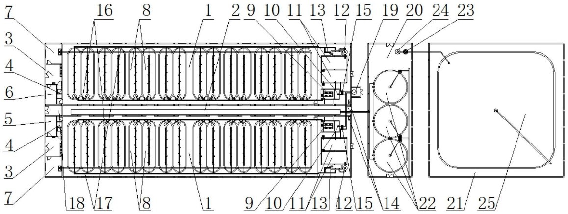 本發(fā)明屬于水產(chǎn)養(yǎng)殖技術(shù)領(lǐng)域,它包括親蝦培育車間養(yǎng)殖用水的內(nèi)循環(huán)的水處理裝置和循環(huán)水養(yǎng)殖車間外排水再利用的水處理裝置。本發(fā)明提供一種適合南美白對蝦親蝦培育的循環(huán)水養(yǎng)殖系統(tǒng)的水處理方法和循環(huán)水養(yǎng)殖車間外排水再利用的水處理方法,使親蝦培育期間的日補充新水降至0.5%以內(nèi),從而有效杜絕了外界病原對親蝦的入侵,為生產(chǎn)無特定病原(SPF)苗種及養(yǎng)殖系統(tǒng)節(jié)能減排提供了有力保障。