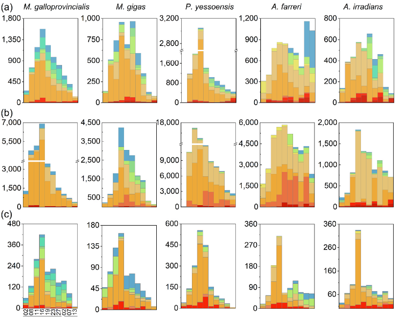 自2016年秦皇島貽貝中毒事件暴發(fā)以來,中國水產(chǎn)科學(xué)研究院黃海水產(chǎn)研究所水產(chǎn)品質(zhì)量安全形成機制與防控技術(shù)創(chuàng)新團隊綜合運用多學(xué)科方法及多組學(xué)技術(shù),系統(tǒng)研究了秦皇島海域麻痹性貝類毒素風(fēng)險發(fā)生的環(huán)境驅(qū)動、形成過程、調(diào)控機制,并對我國傳統(tǒng)模式下消費風(fēng)險進行了評估,初步摸清了該海域麻痹性貝類毒素風(fēng)險發(fā)生的全鏈條及關(guān)鍵風(fēng)險控制點,為科學(xué)構(gòu)建區(qū)域性麻痹性貝類毒素風(fēng)險主動防控技術(shù)提供了研究基礎(chǔ)。相關(guān)成果發(fā)表在Environmental Pollution, Environmental Research, Toxins和Journal of Oceanology and Limnology等期刊上。