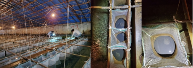 本發(fā)明涉及一種用于大規(guī)模測定大菱鲆個體飼料轉(zhuǎn)化率的裝置及方法,屬于水產(chǎn)養(yǎng)殖領(lǐng)域,所述方法包括如下步驟:(1)制作圓柱形尼龍網(wǎng)箱,底部用圓形PVC板作為支撐。(2)將網(wǎng)箱固定到長方形的養(yǎng)殖池內(nèi),單獨飼養(yǎng)大菱鲆。(3)投喂顆粒飼料并記錄每條魚的日攝食粒數(shù)。(4)根據(jù)公式:個體飼料轉(zhuǎn)化率=個體增重/個體實際總攝食量,得到測試周期內(nèi)每尾大菱鲆的個體飼料轉(zhuǎn)化率。