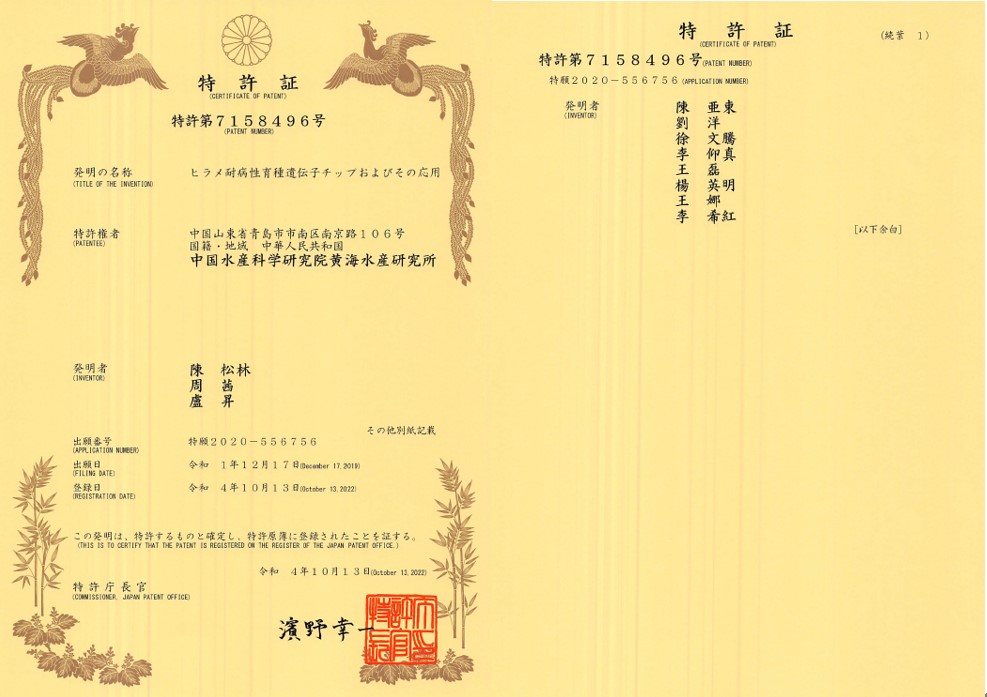 近日,由中國水產(chǎn)科學(xué)研究院黃海水產(chǎn)研究所陳松林等研究發(fā)明的“一種牙鲆抗病育種基因芯片及其應(yīng)用”獲日本發(fā)明專利授權(quán),專利號:特許第7158496號。