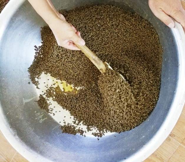 本發(fā)明屬于水產(chǎn)養(yǎng)殖技術(shù)領(lǐng)域。在半滑舌鰨養(yǎng)殖過(guò)程中,腸炎是常見(jiàn)的病害,一旦得病,則很難治療,極易造成養(yǎng)殖損失,而前期預(yù)防是避免腸炎發(fā)生最有效的措施。本發(fā)明通過(guò)將一定比例的葡萄糖粉劑和乳酸菌加到清水中,攪拌均勻,然后緩慢加入飼料中,并不停攪拌,直至水被完全吸收,然后將飼料風(fēng)干后投喂;針對(duì)半滑舌鰨攝食特性和循環(huán)水水交換量大等特點(diǎn),對(duì)進(jìn)水管進(jìn)行了改進(jìn),并通過(guò)調(diào)整進(jìn)水方向等方法,有效減少了飼料的浪費(fèi),進(jìn)而有效的預(yù)防了腸炎的發(fā)生,提高了養(yǎng)殖成活率。