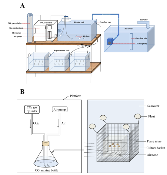 “現(xiàn)場流水”酸化模擬實(shí)驗系統(tǒng)(A)和“海上原位”酸化模擬實(shí)驗平臺(B)示意圖