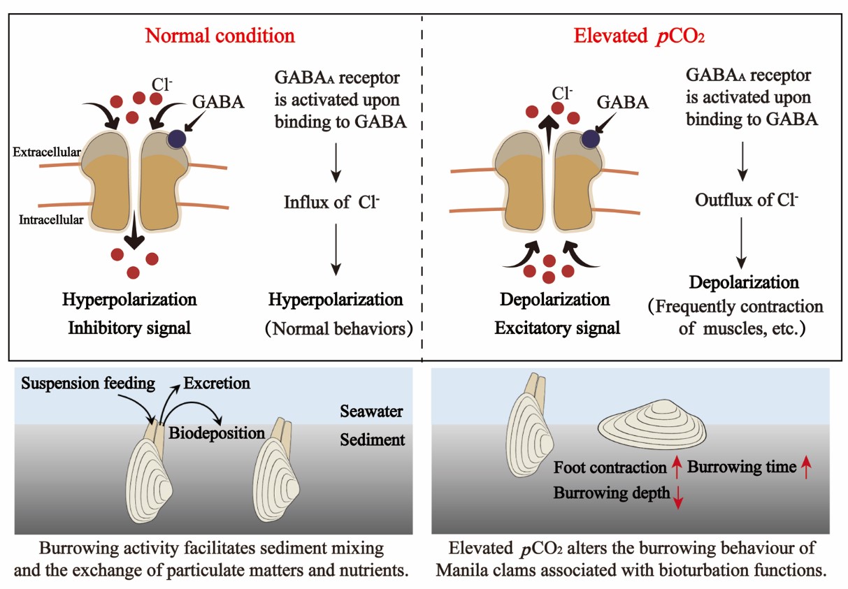 該團(tuán)隊在創(chuàng)建原位酸化模擬實(shí)驗系統(tǒng)的基礎(chǔ)上,以重要經(jīng)濟(jì)貝類長牡蠣和菲律賓蛤仔為實(shí)驗對象,采用“現(xiàn)場流水系統(tǒng)+PAMAS+PreSens”的貝類生理能量學(xué)標(biāo)準(zhǔn)化測定方法,系統(tǒng)解析了長牡蠣和菲律賓蛤仔對海洋酸化脅迫的生理響應(yīng)及其調(diào)節(jié)機(jī)制。結(jié)果表明,海洋酸化脅迫顯著降低了長牡蠣的濾水率,增加了耗氧和排氨率,導(dǎo)致了其生長余力的降低;海洋酸化脅迫通過影響菲律賓蛤仔細(xì)胞內(nèi)外的酸堿平衡狀態(tài)(pH、[HCO3-]等),逆轉(zhuǎn)γ-氨基丁酸A型神經(jīng)受體(GABAA受體)的功能(即由輸出抑制信號轉(zhuǎn)變?yōu)檩敵雠d奮信號),進(jìn)而導(dǎo)致菲律賓蛤仔潛沙行為的改變。