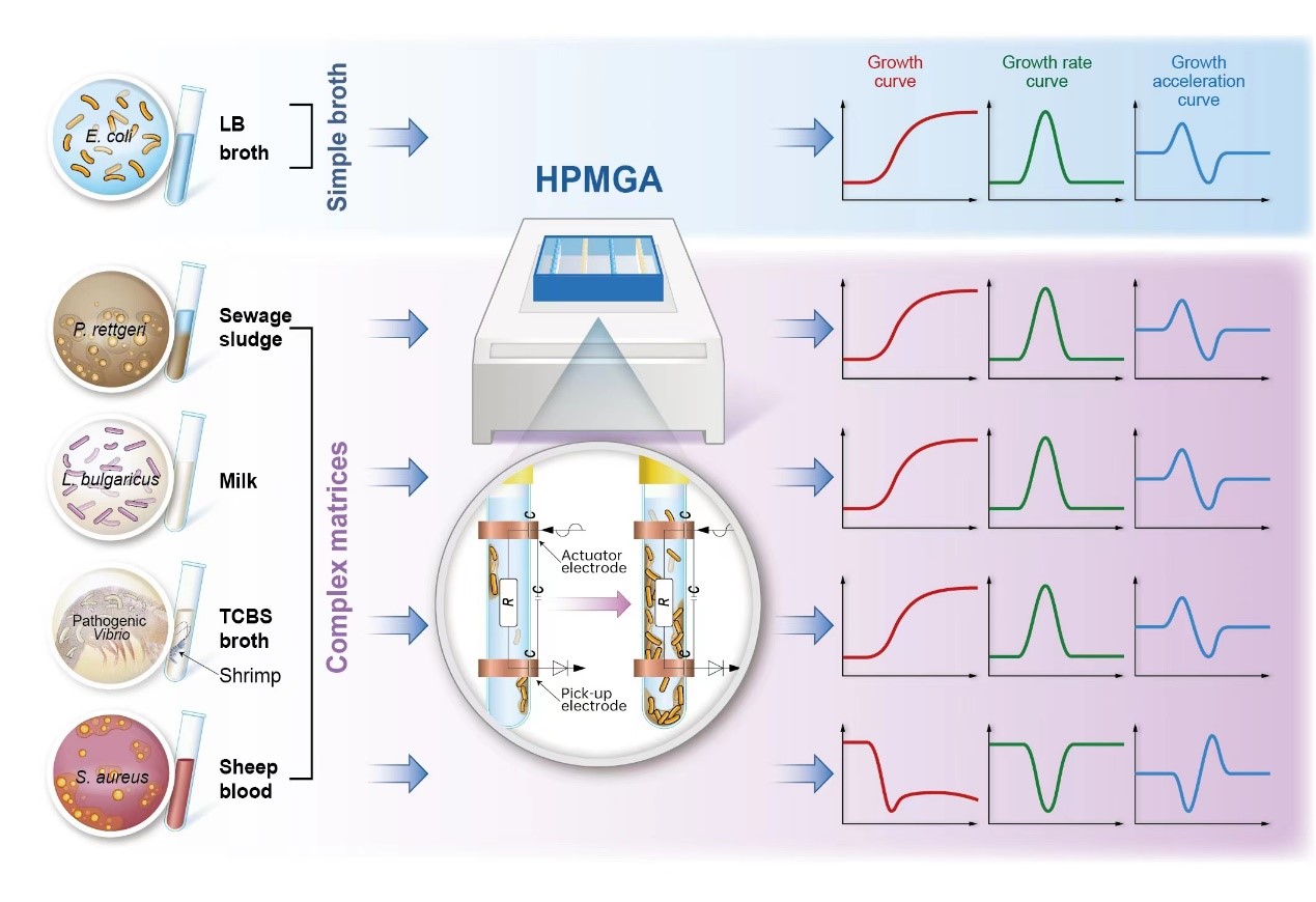 生命、農(nóng)業(yè)、環(huán)境、醫(yī)藥、臨床、化學(xué)、化工、食品、材料、工業(yè)、國(guó)防等眾多領(lǐng)域的科研和生產(chǎn)都需要精確掌握目標(biāo)微生物的生長(zhǎng)代謝特征。但如何高效、精準(zhǔn)測(cè)定真實(shí)基質(zhì)中微生物的生長(zhǎng)動(dòng)力學(xué)曲線始終是一個(gè)難以克服的技術(shù)瓶頸。這是因?yàn)榭蒲泻蜕a(chǎn)真實(shí)場(chǎng)景中人們面臨的基質(zhì)往往具有復(fù)雜的物理和化學(xué)性質(zhì),采用光學(xué)法測(cè)定其中微生物的生長(zhǎng)過(guò)程時(shí),由于共存物質(zhì)會(huì)產(chǎn)生折射、反射、散射、吸收等干擾,信號(hào)的準(zhǔn)確性和重現(xiàn)性較差;采用傳統(tǒng)的電化學(xué)方法測(cè)定其中微生物的生長(zhǎng)過(guò)程時(shí),囿于不可避免的電極污染、極化和鈍化現(xiàn)象,信號(hào)的準(zhǔn)確性和重現(xiàn)性也不理想。