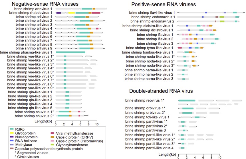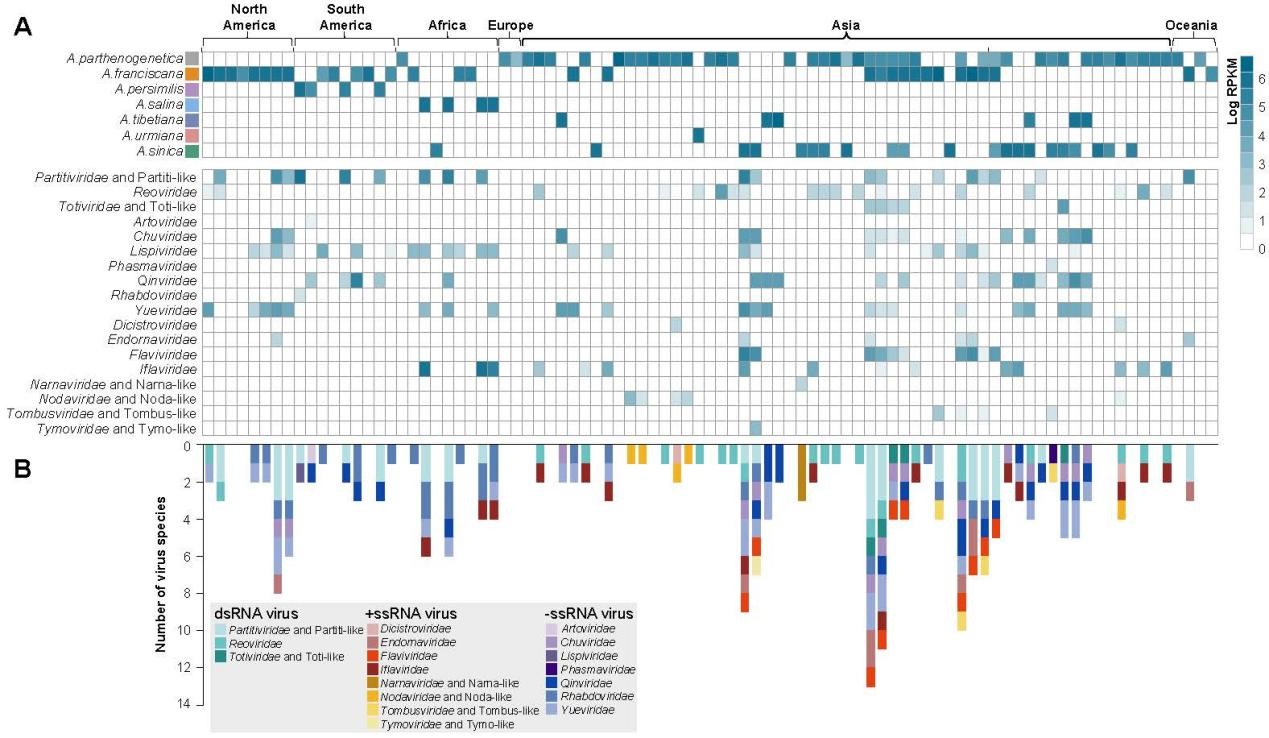 高鹽生態(tài)系統(tǒng)包括鹽湖、鹽沼等,具有高鹽度、高冰點和溶氧變化快等特點,被視為“極端生態(tài)系統(tǒng)”。鹵蟲(Artemia)為廣鹽性生物,在全球高鹽生態(tài)系統(tǒng)中均有分布,是水產(chǎn)養(yǎng)殖中重要的生物餌料。該研究對1977-2019年收集自六大洲、21個國家和100多個采樣地的143批鹵蟲卵樣本開展病毒組分析,鑒定到可歸類為18個不同病毒家族和相關類群的55種新型RNA病毒,分析揭示出一些病毒間存在全球聯(lián)系,特別是在亞洲和北美洲之間,發(fā)現(xiàn)人類活動可能推動了這些病毒間的全球關聯(lián)性。研究揭示了鹵蟲中病毒的多樣性,為了解全球高鹽生態(tài)系統(tǒng)中以前未被認識的RNA病毒圈提供了新的見解。