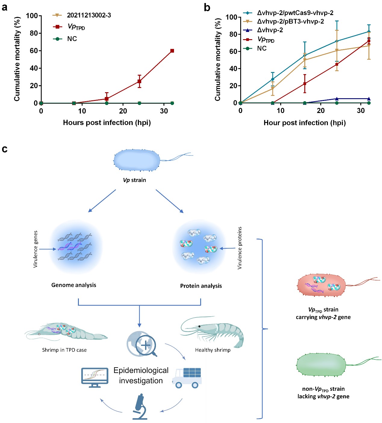 研究發(fā)現(xiàn),TPV是由攜帶沙門氏菌毒性質(zhì)粒毒力基因與殺蟲蛋白毒力基因(雙毒力基因)的弧菌(Vibriospp. causing TPV,VTPV)引起的細菌性疫病。TPV關(guān)鍵毒力因子VHVP-2由187 kb毒性質(zhì)粒上的關(guān)鍵毒力基因vhvp-2編碼,后者位于VTPV毒性質(zhì)??梢苿釉?,具有在不同弧菌菌株間擴散的能力,VTPV因獲得了關(guān)鍵毒力基因vhvp-2基因而對對蝦仔蝦具有了強毒力和高致死性。這是自2020年TPV大規(guī)模爆發(fā)流行以來,首次揭示其致病菌VTPV的高致死性致病機制。TPV多發(fā)生于對蝦仔蝦期P5~P7階段,傳播速度快,致死率高,發(fā)病2-3天仔蝦死亡率超過90%。自2020年以來,TPV在沿海地區(qū)持續(xù)流行危害,給我國對蝦養(yǎng)殖產(chǎn)業(yè)造成了重大經(jīng)濟損失。本研究是繼該團隊在TPV大規(guī)模爆發(fā)流行期間首次鑒定到玻璃苗致病菌(Zouet al., 2020)等工作之后,在VTPV致病機制研究方面取得的又一重要成果。
