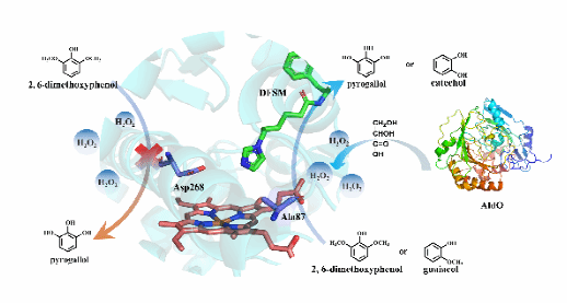 研究團(tuán)隊通過計算機模擬、基因工程及化學(xué)修飾等多維優(yōu)化策略,構(gòu)建了一種基于細(xì)胞色素P450BM3-糖醇氧化酶(Sugar Alcohol Oxidase,AldO)的復(fù)合生物催化體系,在雙功能小分子(Dual functional small molecule,DFSM)的輔助下,實現(xiàn)了愈創(chuàng)木酚(G-木質(zhì)素單體)的高效脫甲基化(TON=1895±4)和2, 6-二甲氧基苯酚(S-木質(zhì)素單體)的雙脫甲基轉(zhuǎn)化(TON=483±7)。該生物催化體系經(jīng)濟(jì)實用,為木質(zhì)素芳香族化合物的生物催化降解提供了創(chuàng)新性的解決方案。該研究不僅拓寬了血紅素蛋白的應(yīng)用領(lǐng)域,也為人工金屬酶的理性設(shè)計與應(yīng)用提供了新的理論依據(jù)和技術(shù)路徑。