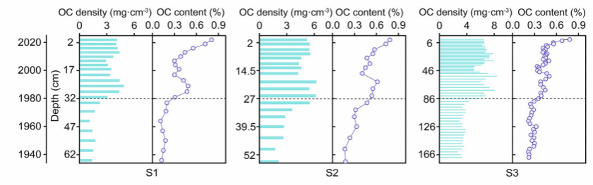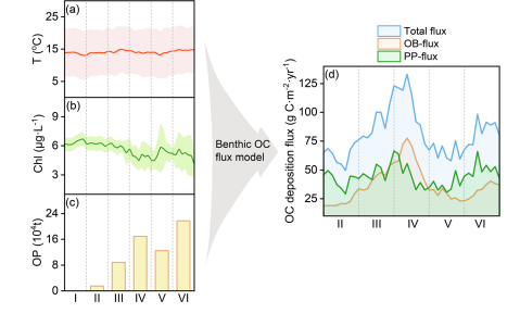 研究團(tuán)隊聚焦北方規(guī)?;B(yǎng)殖海灣-桑溝灣,通過分析近百年沉積巖芯,發(fā)現(xiàn)集約化牡蠣養(yǎng)殖使沉積物有機碳埋藏通量提升2.6倍,達(dá)91.6–106g C·m-2·yr-1,這一效率可以比擬紅樹林、海草床等典型藍(lán)碳生態(tài)系統(tǒng)。其中,微生物殘體是沉積有機碳的關(guān)鍵組成部分,貢獻(xiàn)率在30–42%,遠(yuǎn)高于非養(yǎng)殖區(qū)7–22%。而借由微生物殘體形成難降解有機碳占比從養(yǎng)殖前的42.5%升至60.2%,從而增強了沉積碳的穩(wěn)定性。以此推算,全球牡蠣養(yǎng)殖每年可促成約47萬噸碳沉積,其中28萬噸以難降解形式長期封存。廣義線性混合模型(GLMM)分析顯示,牡蠣產(chǎn)量、生物沉積通量與溫度是埋藏效率的顯著負(fù)驅(qū)動因子。