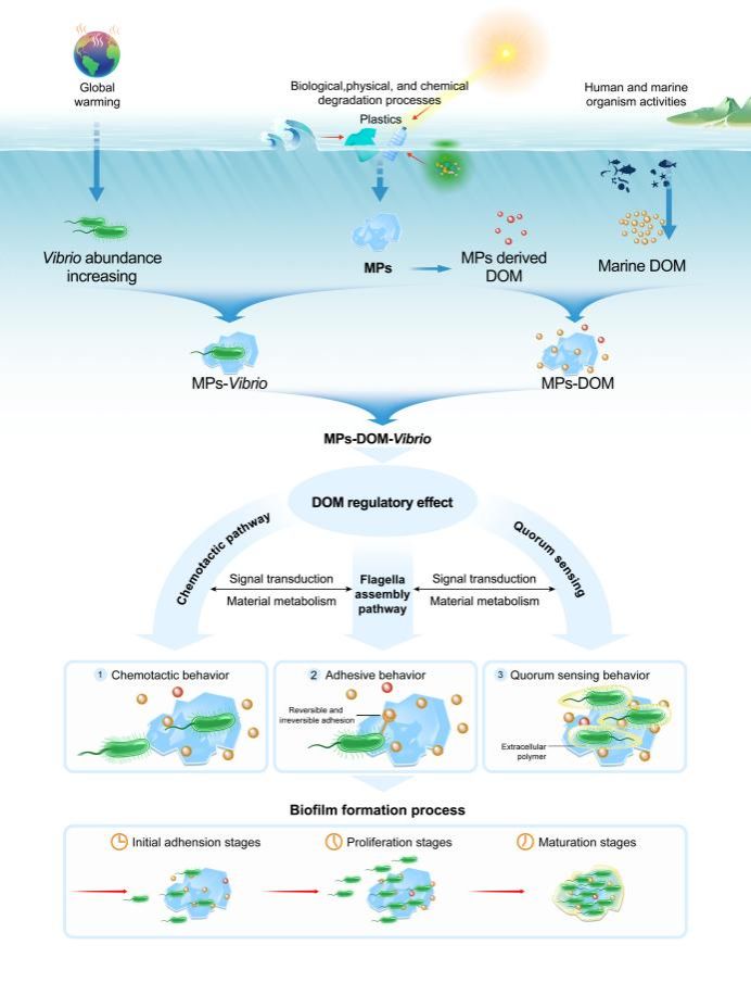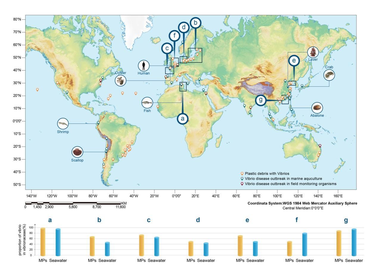 全球微塑料污染日益嚴峻,其對海洋生態(tài)系統(tǒng)的潛在影響備受關(guān)注。微塑料表面形成的特殊微生物群落——“塑料圈”(Plastisphere),可能成為病原微生物(如病原性弧菌等)的載體,對海洋生態(tài)健康和水產(chǎn)養(yǎng)殖安全構(gòu)成威脅。深入理解微塑料-弧菌的相互作用及其生態(tài)風(fēng)險,對保護海洋環(huán)境與人類健康意義重大。