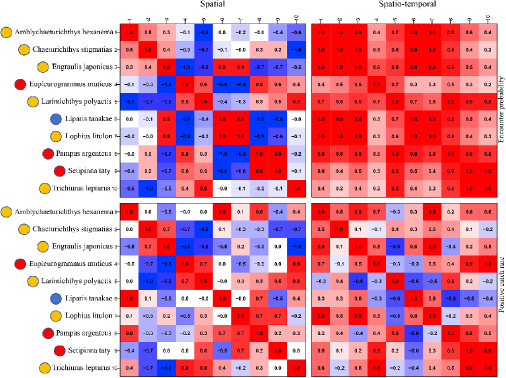 團隊基于渤海10種關鍵魚類10年漁業(yè)資源調查數據,構建了多物種時空模型(VAST),研究發(fā)現:1)渤海低經濟捕食者種類的雙重角色:細紋獅子魚和黃鮟鱇等低經濟價值捕食者與重要餌料魚鳀呈現顯著空間正相關(熱點區(qū)域重疊率達88%以上);并且這些捕食者資源量近年來持續(xù)上升,對小黃魚、銀鯧等高經濟價值魚類產生強烈負作用(時空密度負相關系數達-0.8);2)“食物-風險權衡”驅動渤海魚類棲息地分化:小黃魚雖以鳀為主要食物,但需規(guī)避捕食者,其分布熱點與鳀顯著分離,這一“生存策略”使得小黃魚種群近年來集中在渤海遼東灣北部及黃河口,而非歷史上的渤海全域分布模式;3)渤海具有不同空間分布的四大類群:模型識別出渤海四類生態(tài)功能群,具有明確空間分隔特征,不同類群間棲息地重疊度低,為針對性漁業(yè)資源管理奠定基礎。