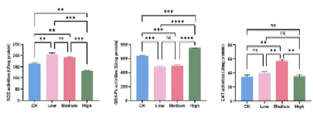 一是氧化應(yīng)激損傷。暴露于500Hz連續(xù)噪聲導(dǎo)致大黃魚體內(nèi)活性氧(ROS)過量累積;超氧化物歧化酶(SOD)活性在低噪聲組最高,高噪聲組顯著下降;谷胱甘肽過氧化物酶(GSH-Px)活性先降后升,高噪聲組達(dá)到峰值;過氧化氫酶(CAT)活性在中噪聲組最高,高噪聲組與對照組相近。噪聲暴露破壞機體抗氧化酶系統(tǒng)正常功能,高強度噪聲可能超越其抗氧化防御能力。