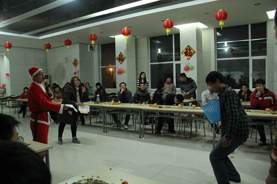 晚會節(jié)目主要由游戲組成,穿插部分歌曲,均由研究生自編自演。晚會在圣誕音樂中拉開序幕,隨后一首活力四射的勁歌,圣誕老人、圣誕奶奶裝扮出現(xiàn)的主持人,再加上主持人詼諧幽默的語言,充分調(diào)動了大家的情緒,現(xiàn)場輕松、活躍、熱烈。