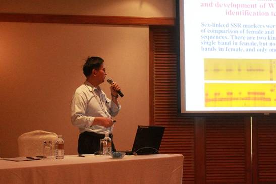 會上,陳松林研究員與中山大學(xué)林浩然院士共同主持了“水產(chǎn)基因組專題討論會”,并作了題為“半滑舌鰨基因組和性別決定機制研究進展” 的學(xué)術(shù)報告,系統(tǒng)介紹了其研究團隊近年來在半滑舌鰨全基因組測序和半滑舌鰨性別決定機制等方面取得的最新研究進展和成果,引起國際同行的高度關(guān)注;邵長偉博士作了題為“牙鲆基因組項目進展”的學(xué)術(shù)報告,詳細介紹了牙鲆全基因組測序、高密度遺傳圖譜構(gòu)建等最新研究進展。
