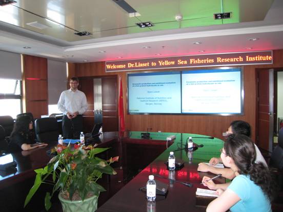 訪問(wèn)期間,Bj?rn Liaset博士為黃海所有關(guān)人員作了題為“Enzymatic production and nutritional evaluation of fish protein hydrolysate”的學(xué)術(shù)報(bào)告,重點(diǎn)介紹了水解蛋白對(duì)動(dòng)物生理代謝等方面的影響以及他本人多年來(lái)在水解蛋白制備、營(yíng)養(yǎng)價(jià)值評(píng)價(jià)及功能研發(fā)方面的重要研究成果,使與會(huì)人員對(duì)海洋蛋白源與動(dòng)物健康研究領(lǐng)域的前沿有了一定的了解,并就有關(guān)學(xué)術(shù)問(wèn)題同與會(huì)人員進(jìn)行了廣泛交流。