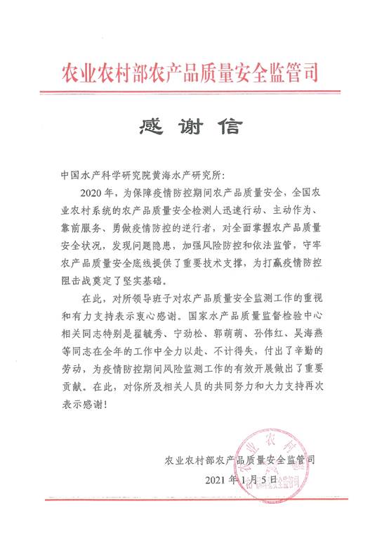 近日,農(nóng)業(yè)農(nóng)村部農(nóng)產(chǎn)品質(zhì)量安全監(jiān)管司向中國水產(chǎn)科學研究院黃海水產(chǎn)研究所發(fā)來致謝信,對黃海水產(chǎn)研究所領(lǐng)導班子在疫情期間對農(nóng)產(chǎn)品質(zhì)量安全監(jiān)測工作的重視和有力支持表示衷心感謝,并對國家水產(chǎn)品質(zhì)量監(jiān)督檢驗中心(以下簡稱中心)在2020年農(nóng)產(chǎn)品質(zhì)量安全監(jiān)測工作中全力以赴、不計得失,付出的辛勤勞動和做出的貢獻提出表揚。