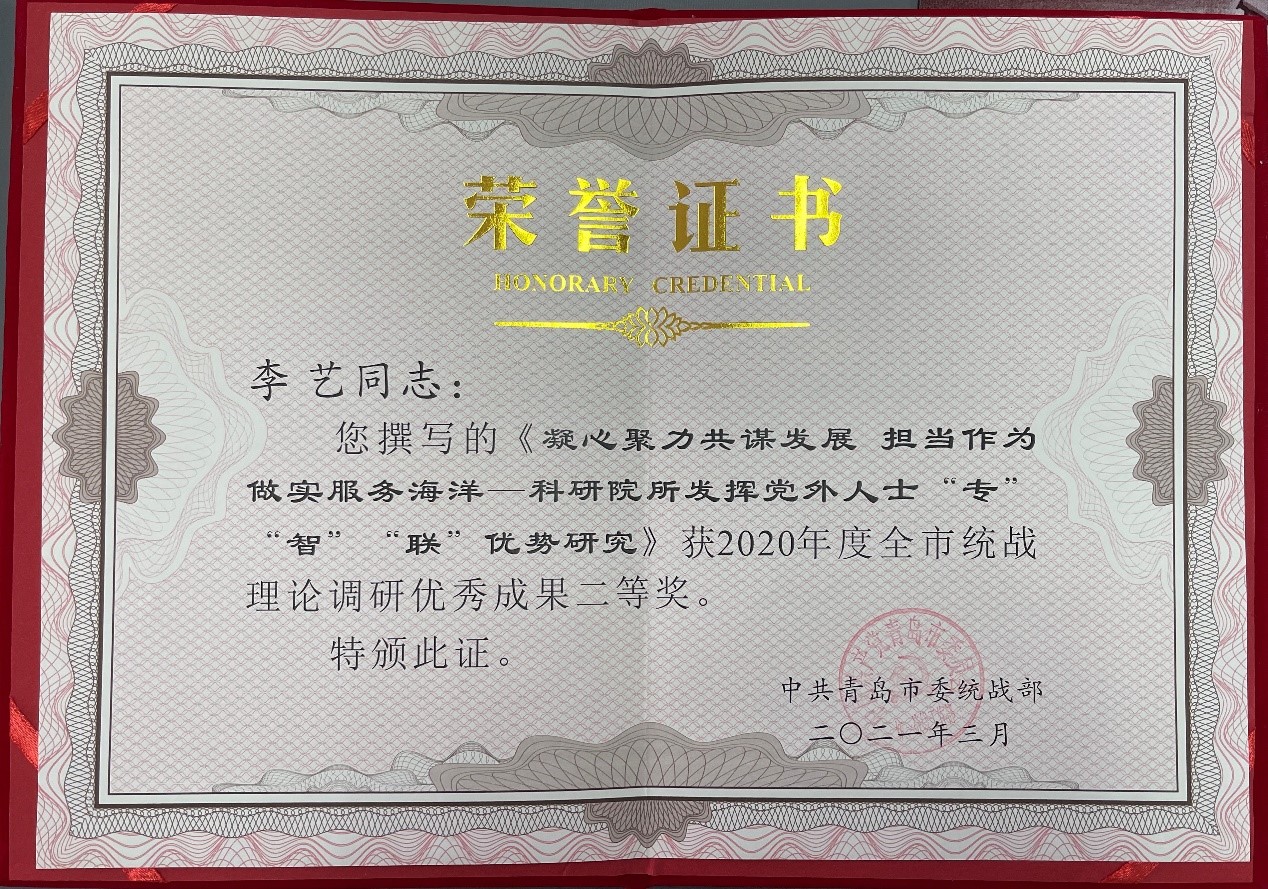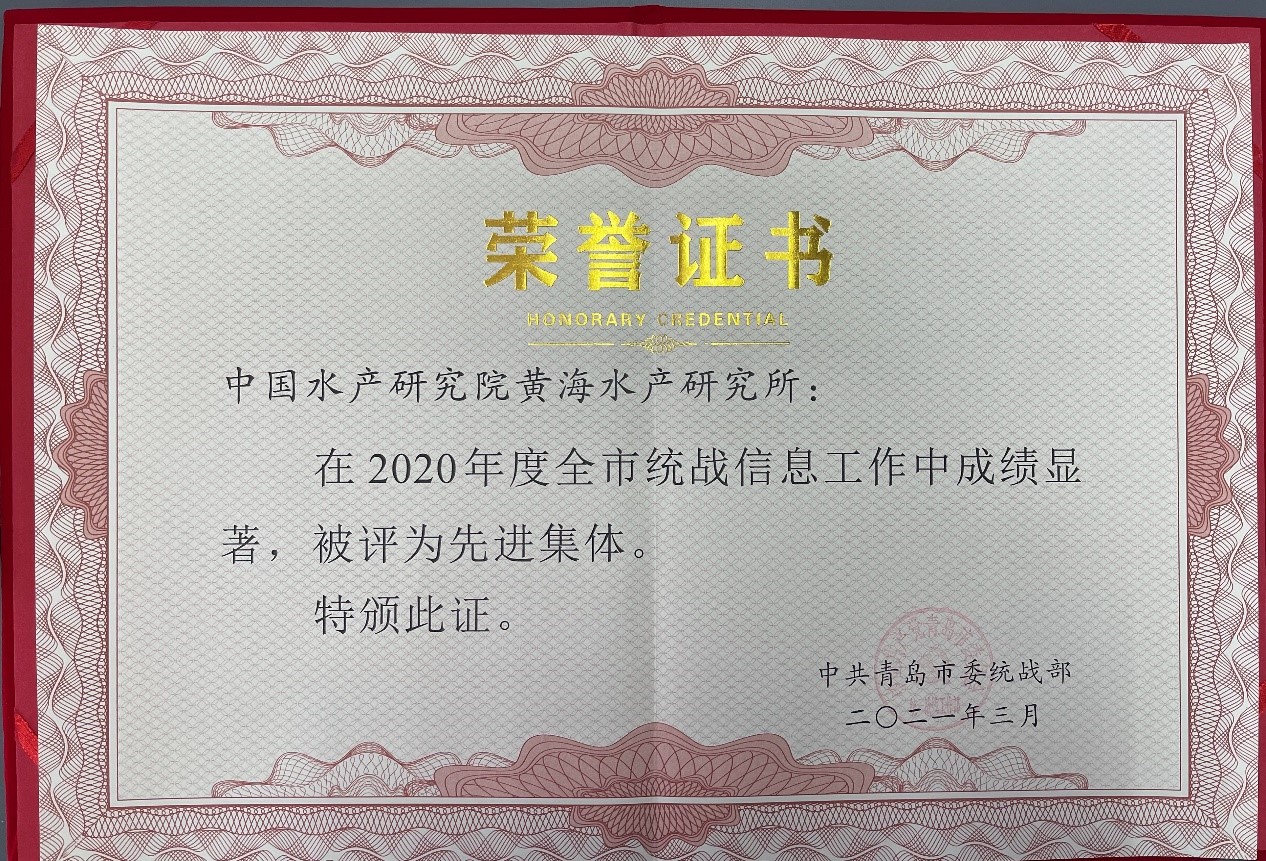 中國(guó)水產(chǎn)科學(xué)研究院黃海水產(chǎn)研究所連續(xù)四年榮獲“2020年度全市統(tǒng)戰(zhàn)信息工作先進(jìn)集體”榮譽(yù)稱(chēng)號(hào),阮曉紅同志榮獲“2020年度全市統(tǒng)戰(zhàn)信息工作先進(jìn)個(gè)人”榮譽(yù)稱(chēng)號(hào),李藝同志撰寫(xiě)的《凝心聚力共謀發(fā)展 擔(dān)當(dāng)作為做實(shí)服務(wù)海洋——科研院所發(fā)揮黨外人士“專(zhuān)”“智”“聯(lián)”優(yōu)勢(shì)研究》獲2020年度全市統(tǒng)戰(zhàn)理論調(diào)研優(yōu)秀成果二等獎(jiǎng)。黃海水產(chǎn)研究所作為先進(jìn)集體代表之一在大會(huì)作《凝心聚力謀發(fā)展 攜手同心譜新篇》經(jīng)驗(yàn)交流發(fā)言。