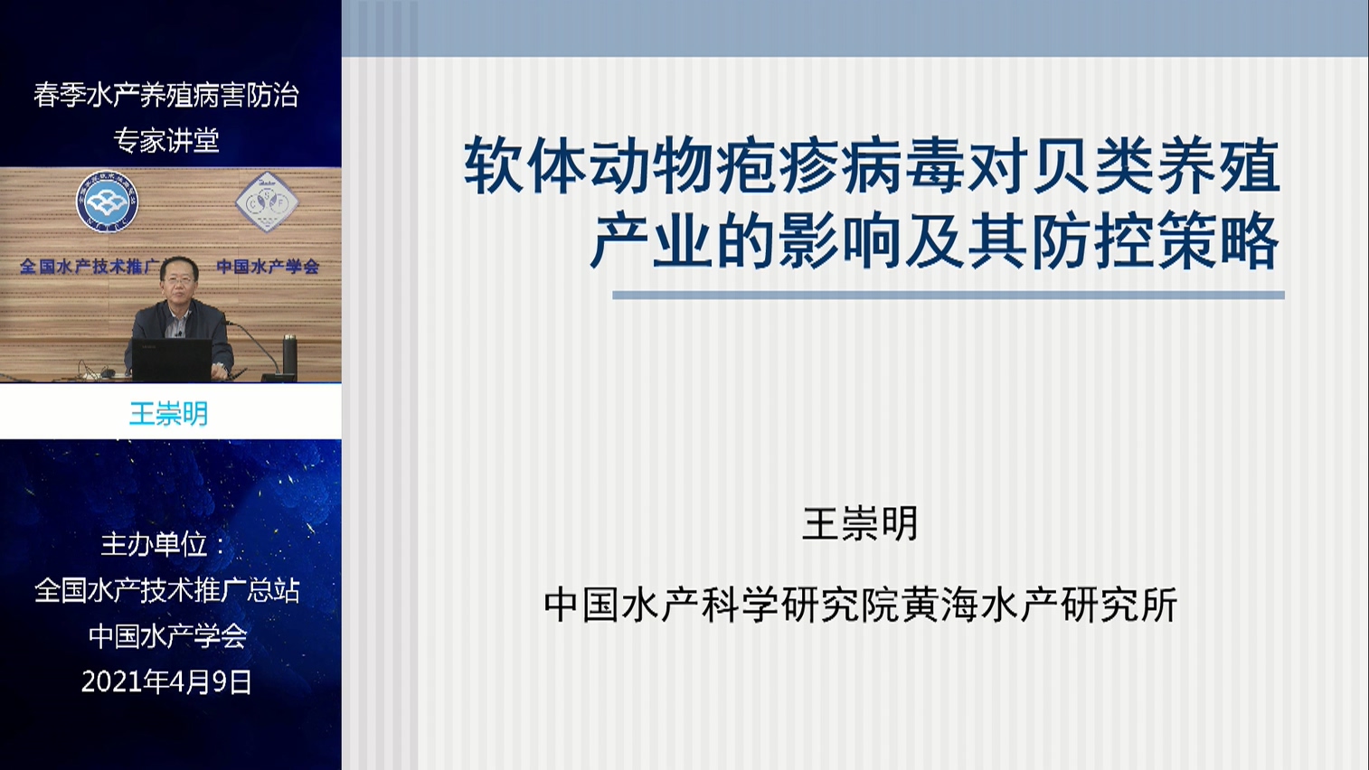 4月9日,應(yīng)全國(guó)水產(chǎn)技術(shù)推廣總站和中國(guó)水產(chǎn)學(xué)會(huì)的邀請(qǐng),中國(guó)水產(chǎn)科學(xué)研究院黃海水產(chǎn)研究所養(yǎng)殖生物疾病控制與分子病理學(xué)研究室張慶利研究員、王崇明研究員做客“2021春季水產(chǎn)養(yǎng)殖病害防治專家講堂”,分別講解了養(yǎng)殖蝦類和貝類春季易發(fā)疾病知識(shí)及防控技術(shù)。
