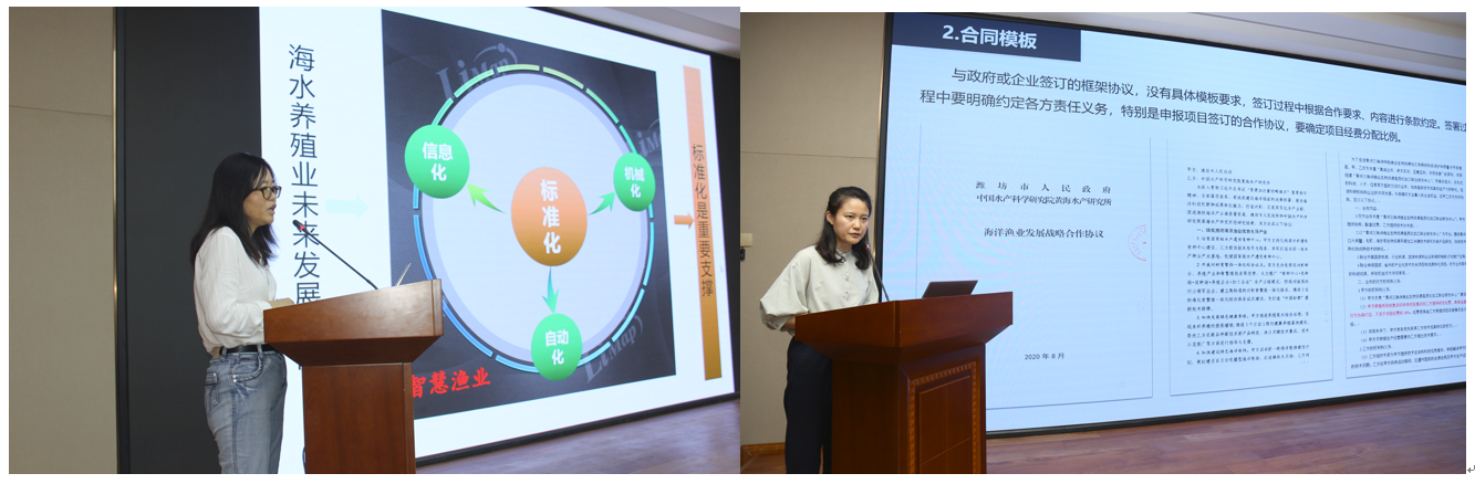 技能培訓活動中,王印庚處長圍繞國家政策支持、全國成果轉化現狀等方面進行了深入分析,重點剖析了我所成果轉化途徑,總結了成果轉化技能要點,分析了“十四五”時期我所成果轉化的重要任務。王曉萍副研究員解讀了技術合同類型選擇、簽訂、法律風險規(guī)避及專利轉化方式等方面相關內容。汪文俊研究員介紹了漁業(yè)標準基本概況、標準體系結構與組成、標準申請制訂工作程序。曲克明主任和孟憲紅主任分享了在產業(yè)技術集成、技術團隊建設、產學研項目爭取、支撐服務能力提升等方面的心得體會。