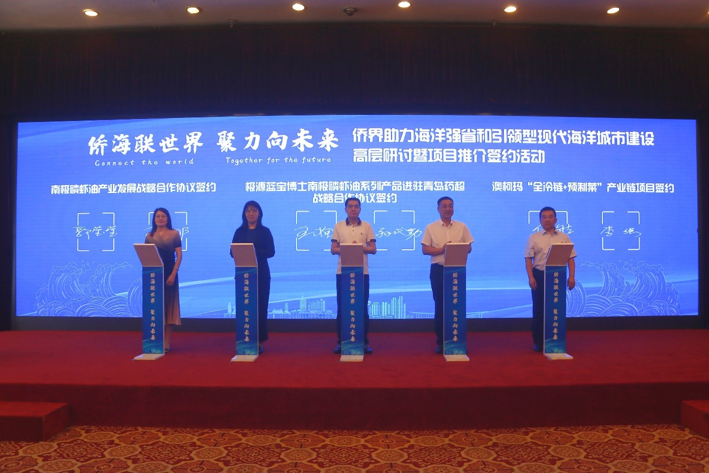 會上,王印庚研究員作為中國僑聯(lián)特聘專家對山東省海洋漁業(yè)重點項目進行現(xiàn)場推介。他從山東省海洋漁業(yè)發(fā)展現(xiàn)狀、區(qū)位優(yōu)勢和黃海水產研究所技術成果儲備出發(fā),提出了“百萬噸滸苔藻蛋白的挖掘及其生物質資源利用”“膠東半島海帶養(yǎng)殖集群與轉型升級發(fā)展”“北方灘涂貝類苗種產業(yè)化基地建設及其種業(yè)開發(fā)”“濱海漁光鹽一體化產業(yè)園區(qū)建設與高效開發(fā)”等5個海洋漁業(yè)重點項目,希望通過實施創(chuàng)新性產業(yè)化項目集群,實現(xiàn)總體經(jīng)濟增效數(shù)百億元的產業(yè)目標,從而推動山東省海洋漁業(yè)高質量發(fā)展。與會現(xiàn)場,黃海水產研究所與濟南極源生物科技有限公司就聯(lián)合開展南極磷蝦產品研發(fā)、質量評價、標準制訂與產品推廣等方面簽署了戰(zhàn)略合作協(xié)議。