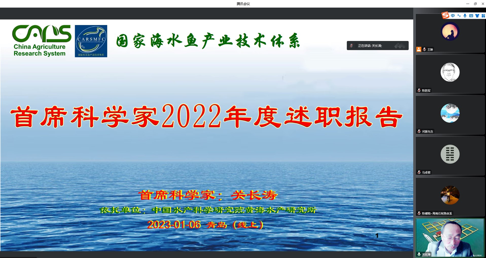 1月9日至10日,國(guó)家海水魚產(chǎn)業(yè)技術(shù)體系(以下簡(jiǎn)稱“海水魚體系”)通過(guò)網(wǎng)絡(luò)會(huì)議形式召開2022年度總結(jié)與考評(píng)工作會(huì)議。來(lái)自農(nóng)業(yè)農(nóng)村部科技教育司、中國(guó)水產(chǎn)科學(xué)研究院、中國(guó)水產(chǎn)科學(xué)研究院黃海水產(chǎn)研究所的領(lǐng)導(dǎo)以及體系顧問(wèn)專家、地方創(chuàng)新團(tuán)隊(duì)首席以及海水魚體系全體崗位科學(xué)家、綜合試驗(yàn)站站長(zhǎng)、團(tuán)隊(duì)成員等140余人參加了會(huì)議。