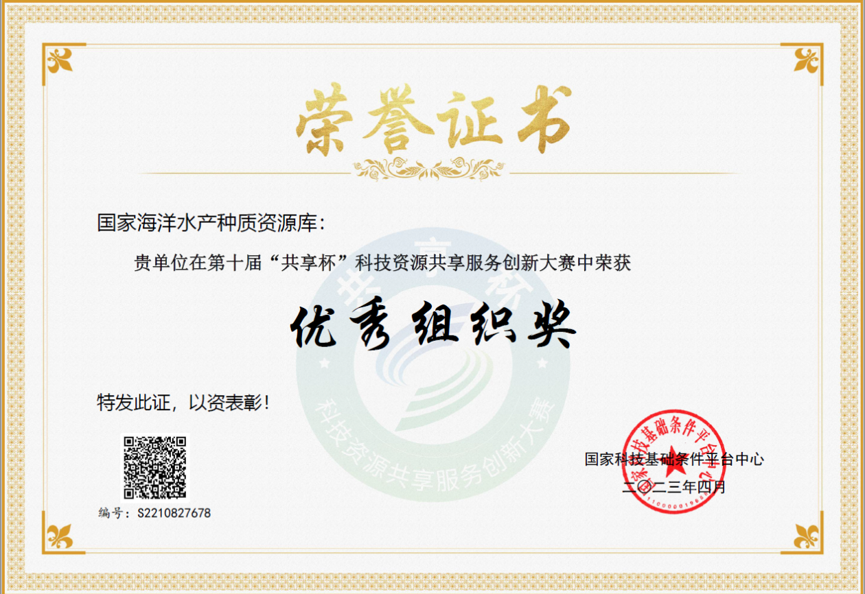 5月10日,科技部國家科技基礎(chǔ)條件平臺中心公布了第十屆“共享杯”科技資源共享服務(wù)創(chuàng)新大賽獲獎作品和表彰獎勵名單,中國水產(chǎn)科學(xué)研究院黃海水產(chǎn)研究所牽頭建設(shè)的國家海洋水產(chǎn)種質(zhì)資源庫榮獲大賽優(yōu)秀組織獎,劉志鴻、邵長偉、趙付文三位同志獲評突出貢獻獎。這也是國家海洋水產(chǎn)種質(zhì)資源庫繼去年獲此獎項后,再次獲得大賽優(yōu)秀組織獎稱號。