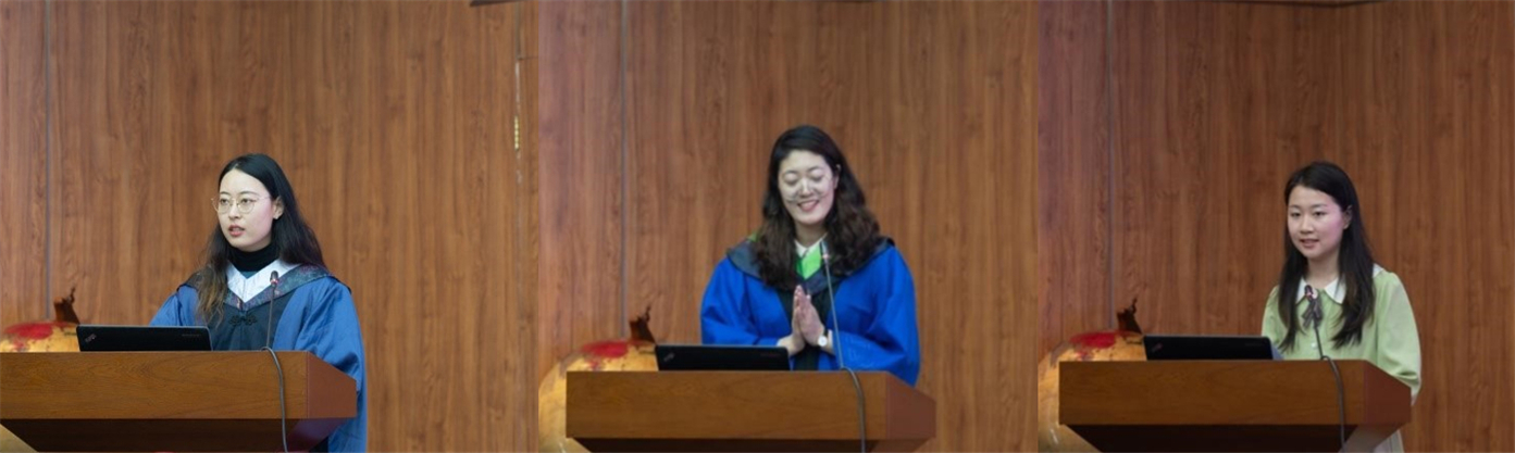 研究生會主席張貝葉、研究生黨支部委員張薇、研究生新生郭曉萌發(fā)言