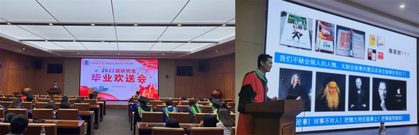 研究生導師代表張慶利研究員和徐后國研究員,從科研思維方法和職業(yè)發(fā)展規(guī)劃的角度,結(jié)合自身研究生培養(yǎng)經(jīng)歷,與畢業(yè)生們分享了科學與實踐、創(chuàng)新與思維、格局與情懷等方面的感悟。鼓勵畢業(yè)生們繼續(xù)以勇于擔當?shù)木窈涂茖W嚴謹?shù)膽B(tài)度投身工作崗位、投身科學研究,繼續(xù)探索、不斷實踐,努力為我國水產(chǎn)事業(yè)發(fā)展貢獻自己的青春力量。
