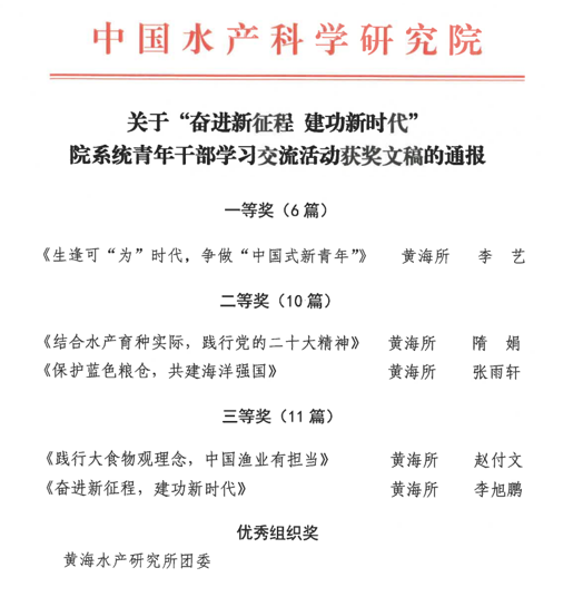 7月20日,中國水產(chǎn)科學(xué)研究院機(jī)關(guān)團(tuán)委公布了《關(guān)于“奮進(jìn)新征程 建功新時(shí)代”院系統(tǒng)青年干部學(xué)習(xí)交流活動(dòng)獲獎(jiǎng)文稿的通報(bào)》,中國水產(chǎn)科學(xué)研究院黃海水產(chǎn)研究所團(tuán)委榮獲優(yōu)秀組織獎(jiǎng),黃海水產(chǎn)研究所李藝獲學(xué)習(xí)文稿一等獎(jiǎng),隋娟、張雨軒獲二等獎(jiǎng),趙付文、李旭鵬獲三等獎(jiǎng)。