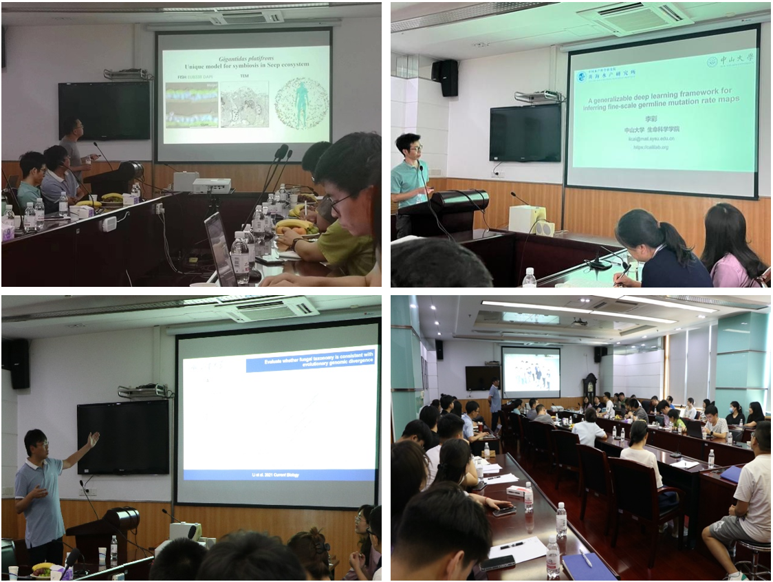 陳凱教授作了題為“細(xì)胞組學(xué)方法開發(fā)及應(yīng)用”的學(xué)術(shù)報告,系統(tǒng)介紹了單細(xì)胞ATAC-Seq 技術(shù)的開發(fā)工作以及結(jié)合單細(xì)胞測序和發(fā)育生物學(xué)手段揭示多巴胺神經(jīng)元終末分化保守的調(diào)控策略。李彩教授作了題為“A generalizable deep learning framework for inferring fine-scale germline mutation rate maps”的學(xué)術(shù)報告,詳細(xì)闡述了基于深度學(xué)習(xí)預(yù)測突變率的方法 — MuRaL (Mutation Rate Learner)。李遠(yuǎn)寧教授作了題為“重建后鞭毛生物生命之樹”的學(xué)術(shù)報告,系統(tǒng)闡述了動物最早的進(jìn)化分支和真菌進(jìn)化歷程。三位教授的報告生動精彩,扎實(shí)的遺傳學(xué)和計算生物學(xué)功底更是讓人印象深刻,參加的師生對三位教授的報告反響熱烈,三位教授和與會師生們就感興趣的問題進(jìn)行了熱烈的交流與深入的討論。