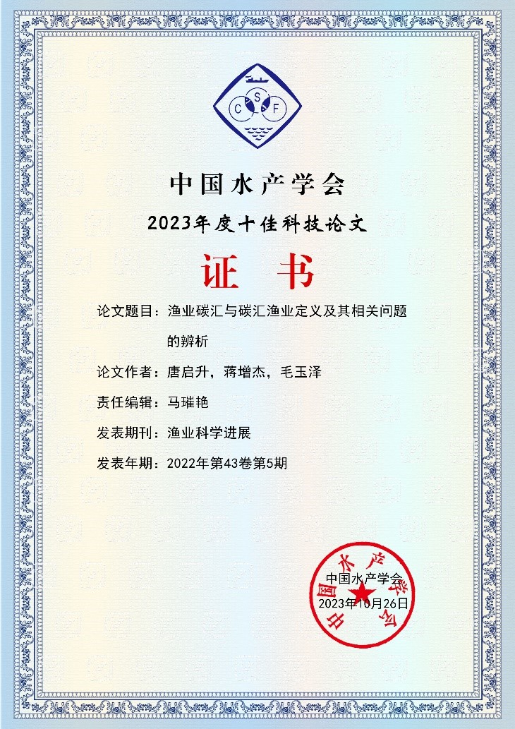11月28日,中國水產(chǎn)學(xué)會成立60周年暨2023范蠡學(xué)術(shù)大會在重慶召開。大會公布了2023年度中國水產(chǎn)學(xué)會科技論文評價結(jié)果。《漁業(yè)科學(xué)進(jìn)展》2022年第43卷第5期的綜述論文《漁業(yè)碳匯與碳匯漁業(yè)定義及其相關(guān)問題的辨析》榮獲中國水產(chǎn)學(xué)會2023年度十佳科技論文,2020年第41卷第1期的研究論文《鹽度對花鱸幼魚鰓、脾及肌肉組織結(jié)構(gòu)的影響》榮獲中國水產(chǎn)學(xué)會2023年度優(yōu)秀科技論文。
