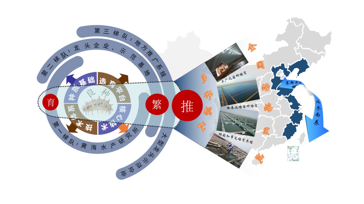 “刺參‘參優(yōu)1號(hào)’育繁推技術(shù)體系建設(shè)及產(chǎn)業(yè)化示范”項(xiàng)目以海參養(yǎng)殖產(chǎn)業(yè)技術(shù)需求為導(dǎo)向,融合科研院所、推廣站、龍頭企業(yè),搭建起“研、推、用”三位一體的種業(yè)平臺(tái),形成產(chǎn)學(xué)研深度融合的科技創(chuàng)新機(jī)制,推動(dòng)創(chuàng)新成果在青島本埠的落地實(shí)施。黃海水產(chǎn)研究所聯(lián)合青島瑞滋集團(tuán)有限公司,采取聯(lián)合申報(bào)科技項(xiàng)目、企業(yè)委托研發(fā)、專(zhuān)利技術(shù)轉(zhuǎn)讓、企業(yè)創(chuàng)新平臺(tái)建設(shè)等多種模式,形成“責(zé)、權(quán)、利”清晰、科研與企業(yè)上下游聯(lián)動(dòng)的合作局面,培育出生長(zhǎng)速度快、抗病力強(qiáng)的“參優(yōu)1號(hào)”國(guó)審水產(chǎn)新品種,苗種市場(chǎng)占有率超30%,建成全國(guó)首個(gè)國(guó)家級(jí)刺參良種場(chǎng),實(shí)現(xiàn)了“技術(shù)研發(fā)、示范應(yīng)用、轉(zhuǎn)化推廣”的目標(biāo)。
