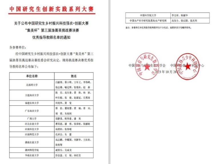 漁菁英挑戰(zhàn)賽是我國水產(chǎn)學(xué)科和漁業(yè)領(lǐng)域的一項國家級賽事,旨在激勵研究生將理論創(chuàng)新與農(nóng)業(yè)實踐相結(jié)合,用所學(xué)所識服務(wù)于鄉(xiāng)村振興。此次黃海水產(chǎn)研究所參賽隊伍在大賽中斬獲佳績充分展現(xiàn)了我所研究生過硬的專業(yè)素質(zhì)和優(yōu)良的精神風(fēng)貌,希望全所研究生以獲獎隊伍為榜樣,再接再厲、篤行不怠,注重實踐鍛煉和創(chuàng)新思維的培養(yǎng),積極為鄉(xiāng)村振興貢獻(xiàn)力量。